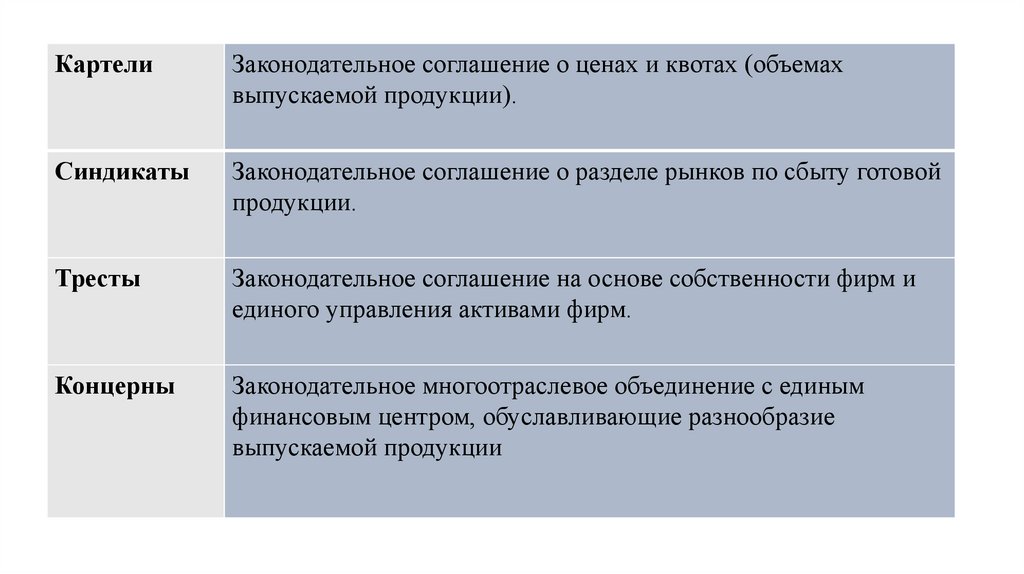 КартелиЗаконодательное соглашение о ценах и квотах (объемах