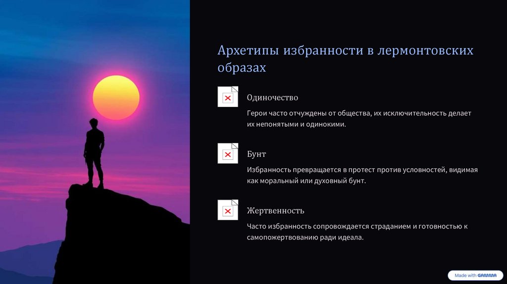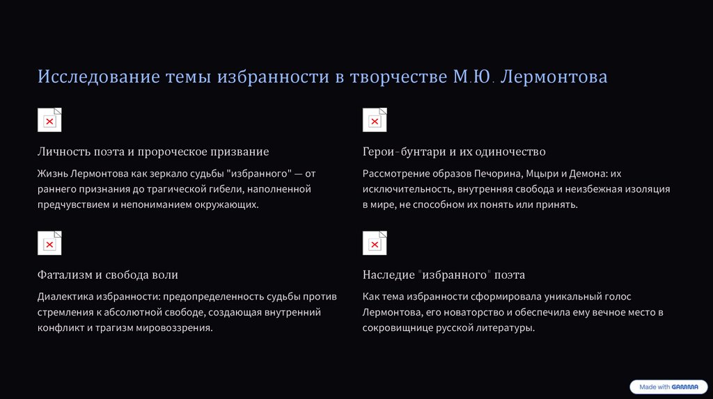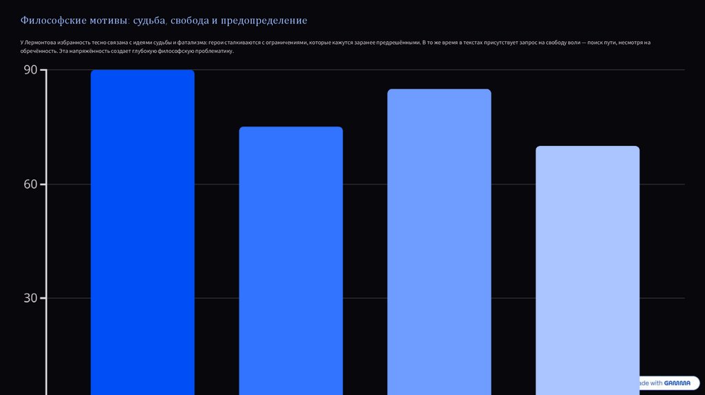 Философские мотивы: судьба, свобода и предопределениеУ Лермонтова избранность тесно связана с идеями судьбы и фатализма: герои сталкиваются с ограничениями, которые кажутся заранее предрешёнными. В то же время в текстах присутствует запрос на свободу воли — поиск пути, несмотря на