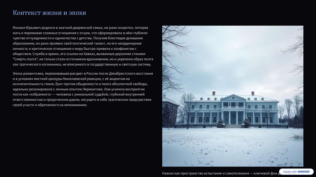 Контекст жизни и эпохиМихаил Юрьевич родился в знатной дворянской семье, но рано осиротел, потеряв