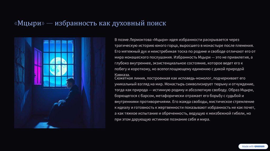 «Мцыри» — избранность как духовный поискВ поэме Лермонтова «Мцыри» идея избранности раскрывается через