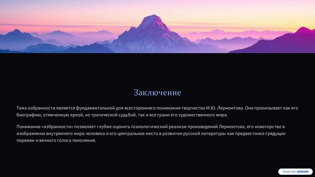 ЗаключениеТема избранности является фундаментальной для всестороннего понимания творчества М.Ю. Лермонтова. Она пронизывает как его
