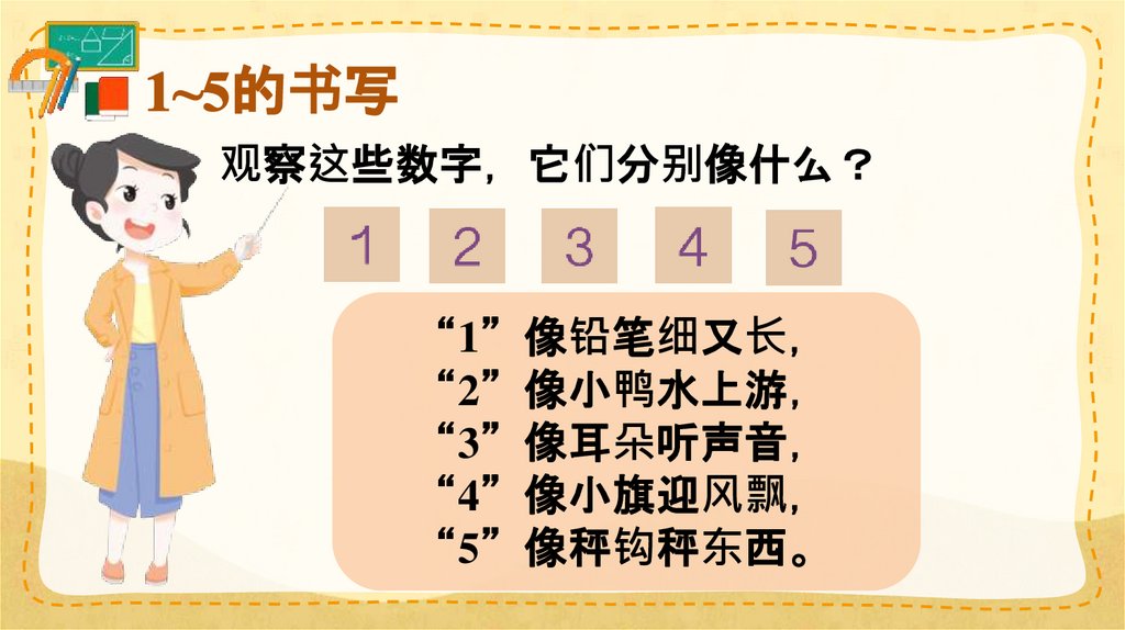 观察这些数字 它们分别像什么“1”像铅笔细又长