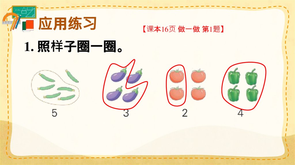 【课本16页 做一做 第1题】1. 照样子圈一圈。