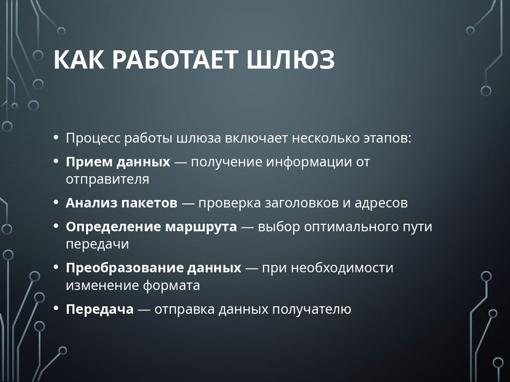 КАК РАБОТАЕТ ШЛЮЗ• Процесс работы шлюза включает несколько этапов: