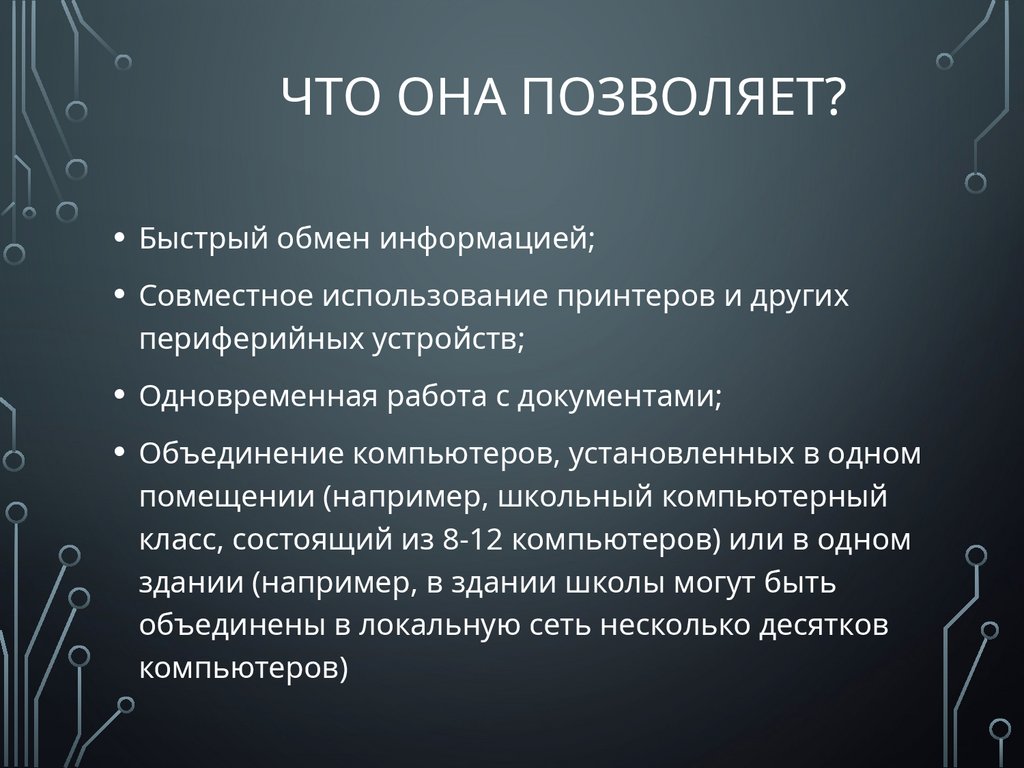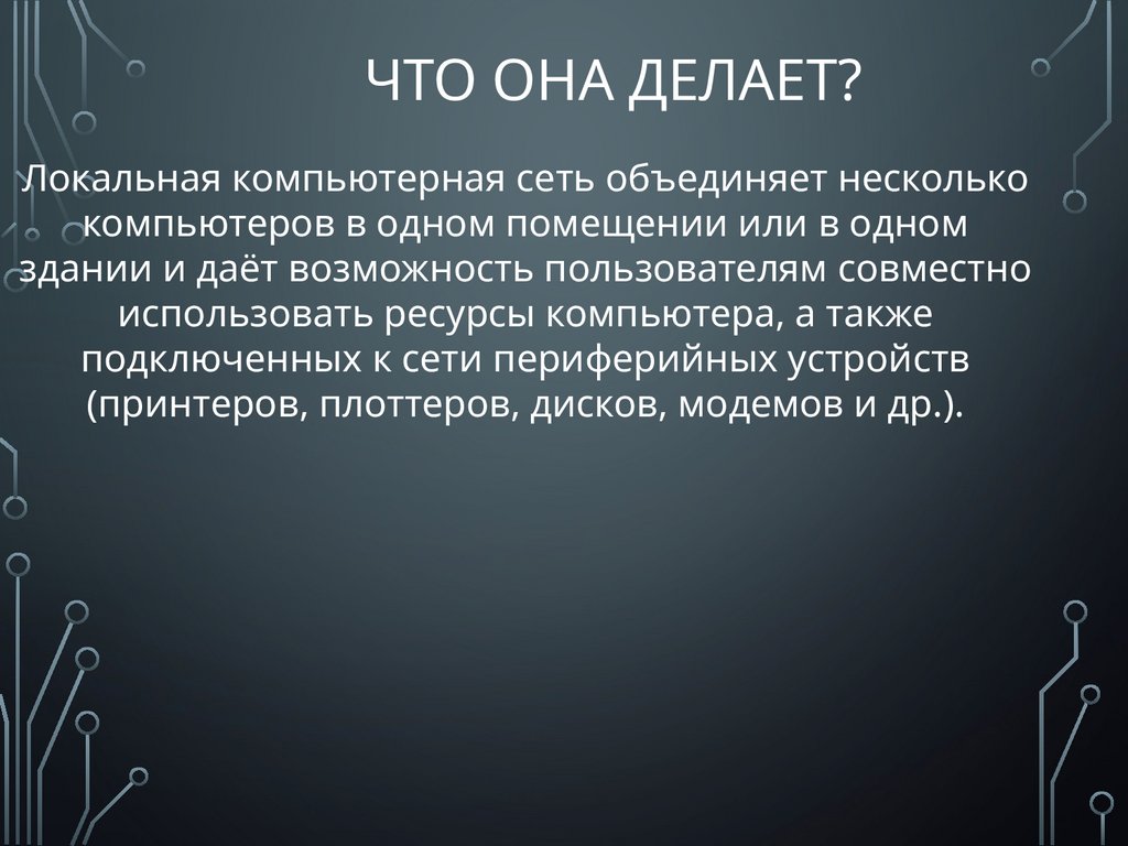 ЧТО ОНА ДЕЛАЕТ?Локальная компьютерная сеть объединяет несколько