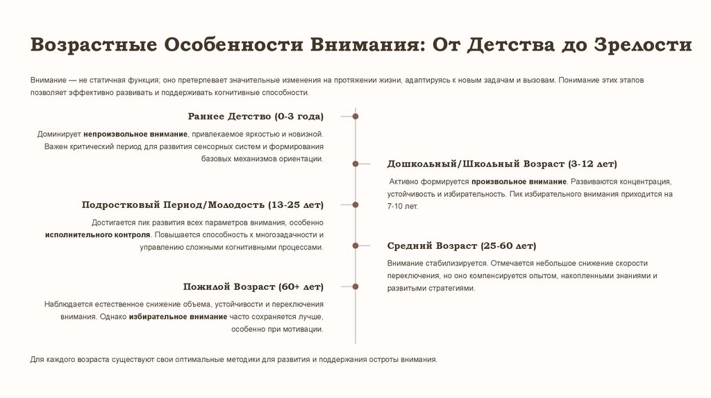Возрастные Особенности Внимания: От Детства до ЗрелостиВнимание — не статичная функция; оно претерпевает значительные изменения на протяжении жизни, адаптируясь к новым задачам и вызовам. Понимание этих этапов