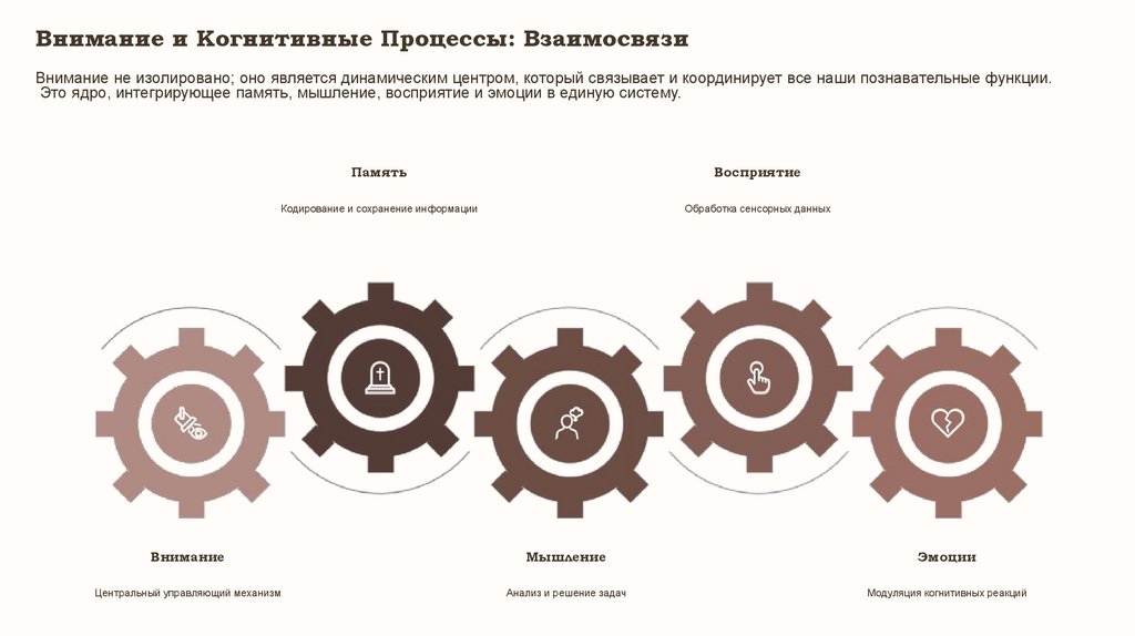 Внимание и Когнитивные Процессы: ВзаимосвязиВнимание не изолировано; оно является динамическим центром, который связывает и координирует все наши познавательные функции.
