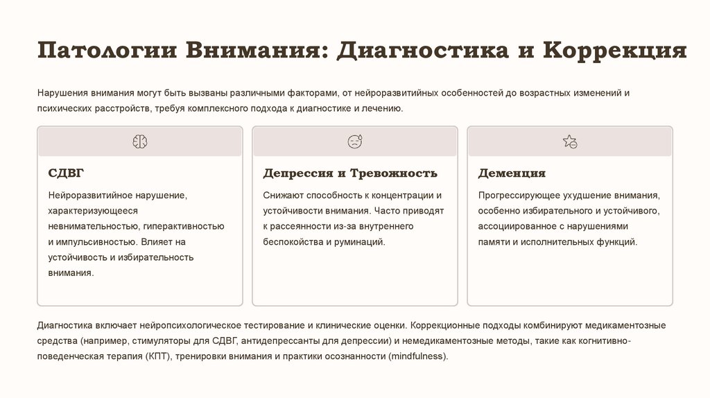 средства (например, стимуляторы для СДВГ, антидепрессанты для депрессии) и немедикаментозные методы, такие как когнитивноповеденческая терапия (КПТ), тренировки внимания и практики осознанности (mindfulness).