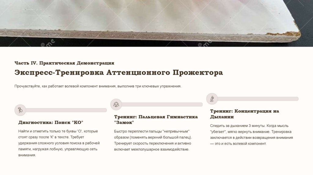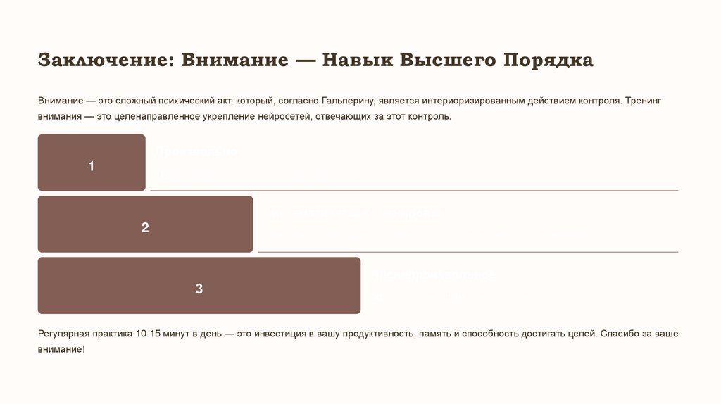 Заключение: Внимание — Навык Высшего ПорядкаВнимание — это сложный психический акт, который, согласно Гальперину, является интериоризированным действием контроля. Тренинг