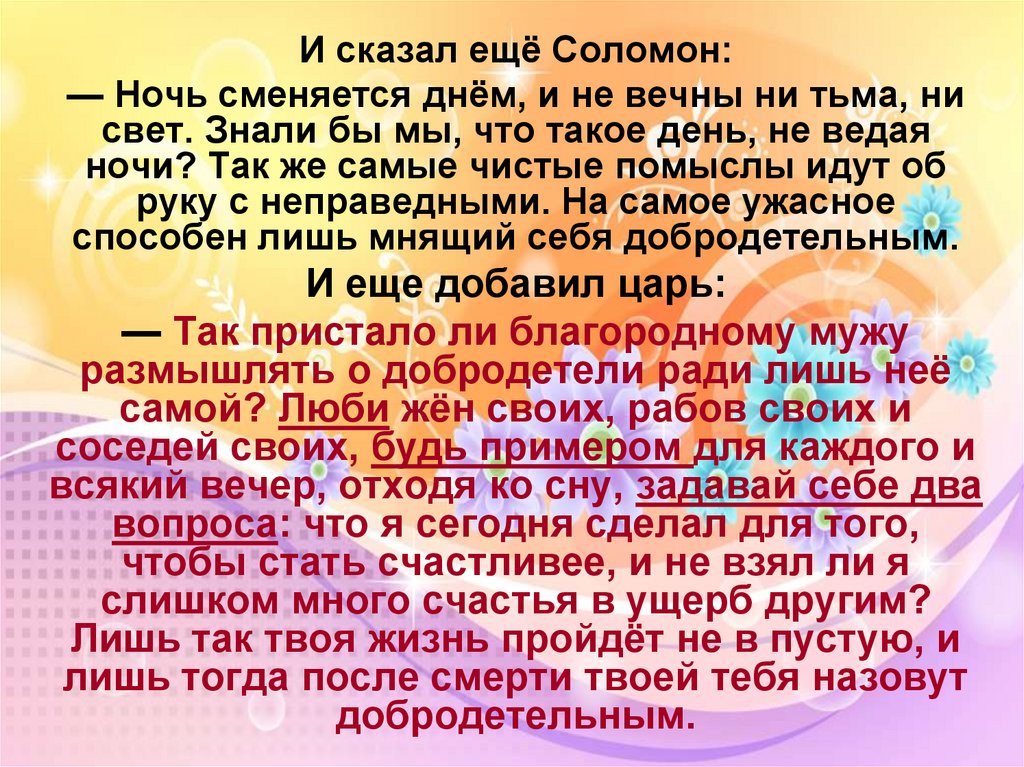 И сказал ещё Соломон:— Ночь сменяется днём, и не вечны ни тьма, ни