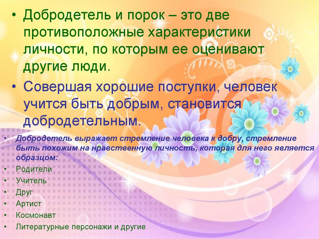 • Добродетель выражает стремление человека кдобру, стремление быть похожим на