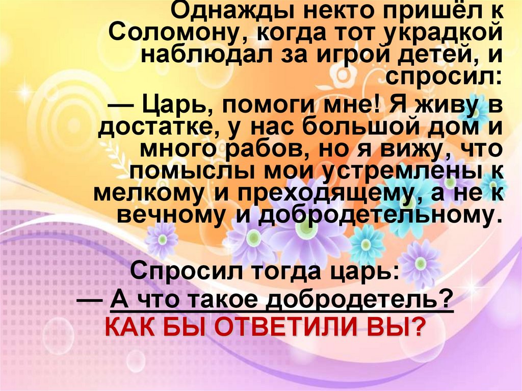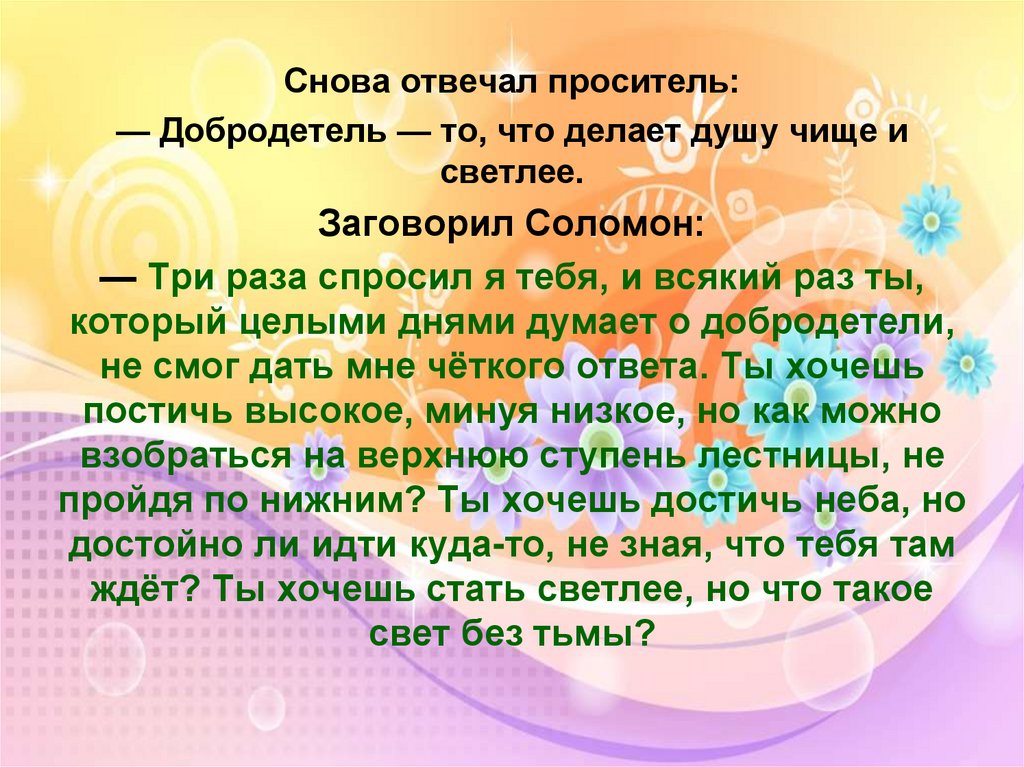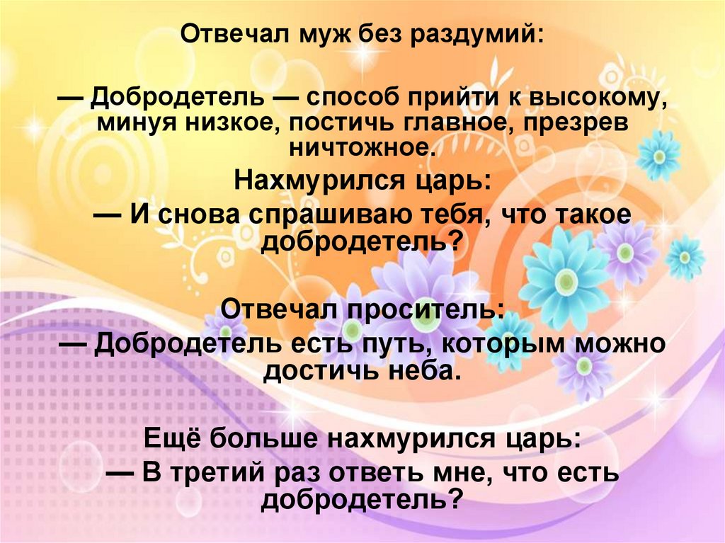 Снова отвечал проситель:— Добродетель — то, что делает душу чище и