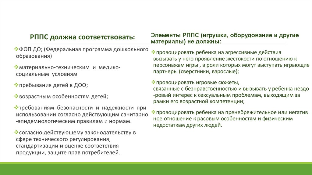 РППС должна соответствовать:Элементы РППС (игрушки, оборудование и другие