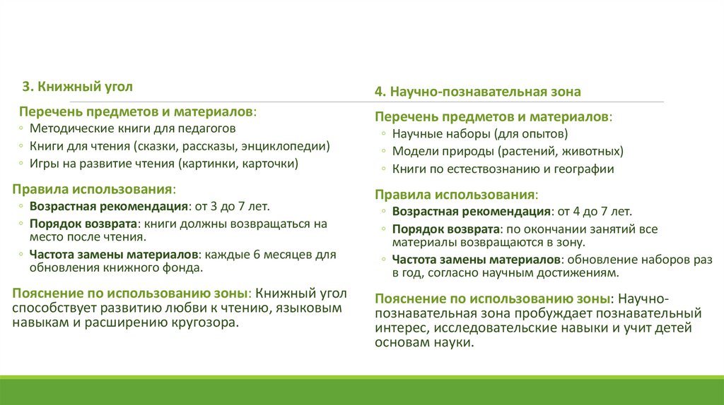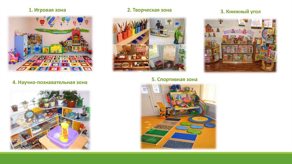 3. Книжный угол4. Научно-познавательная зона