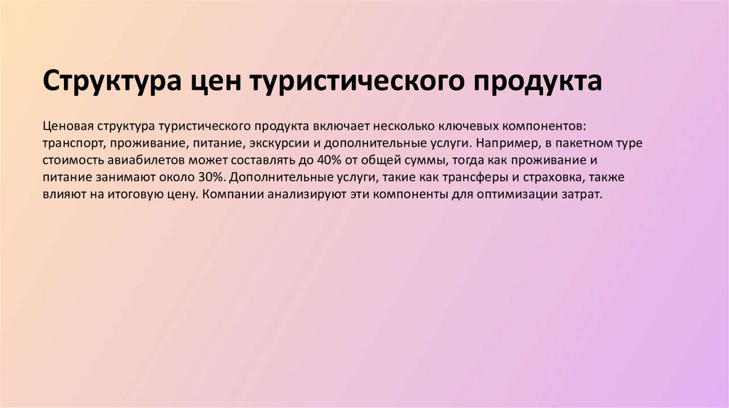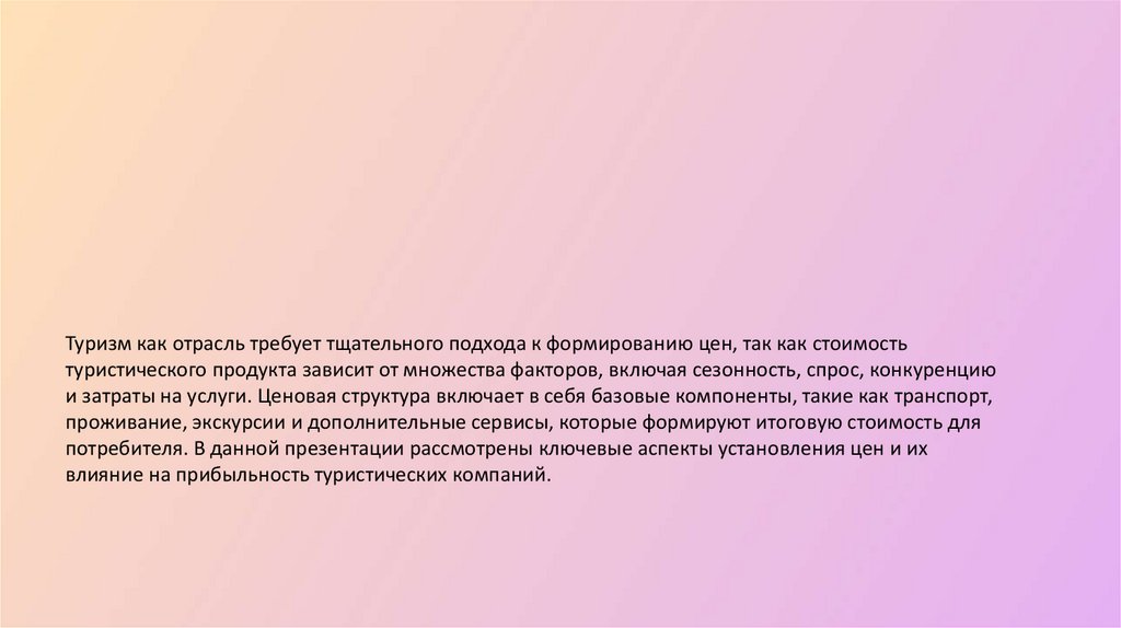 Туризм как отрасль требует тщательного подхода к формированию цен, так как стоимостьтуристического продукта зависит от множества факторов, включая сезонность, спрос, конкуренцию