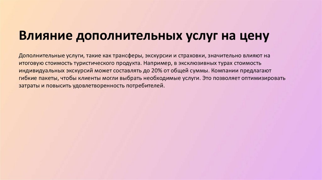 Влияние дополнительных услуг на ценуДополнительные услуги, такие как трансферы, экскурсии и страховки, значительно влияют на