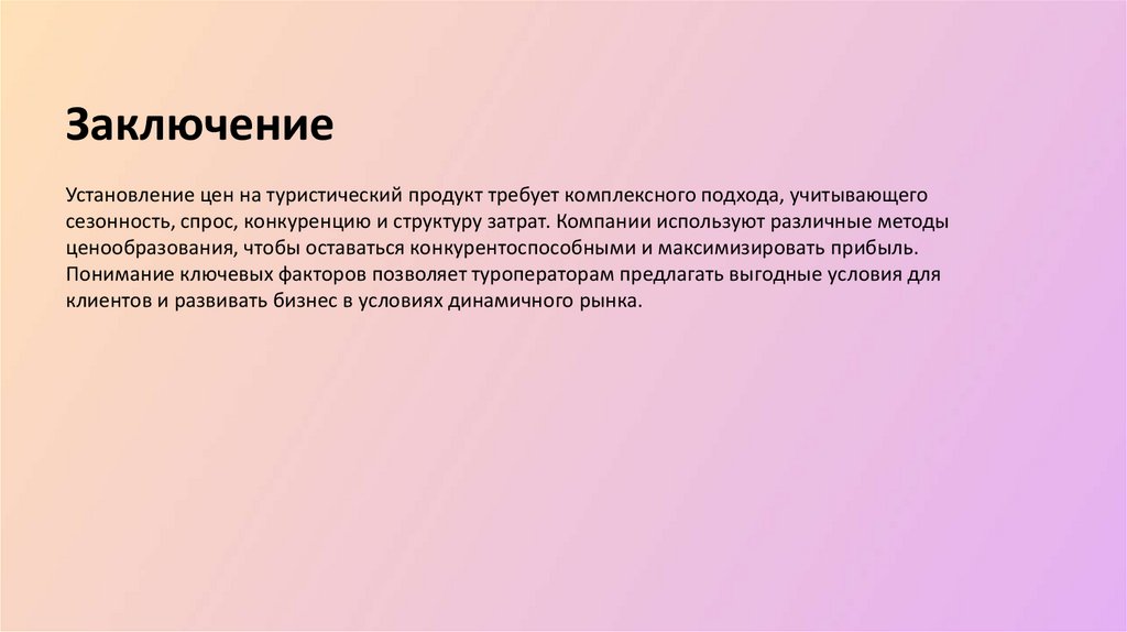 ЗаключениеУстановление цен на туристический продукт требует комплексного подхода, учитывающего