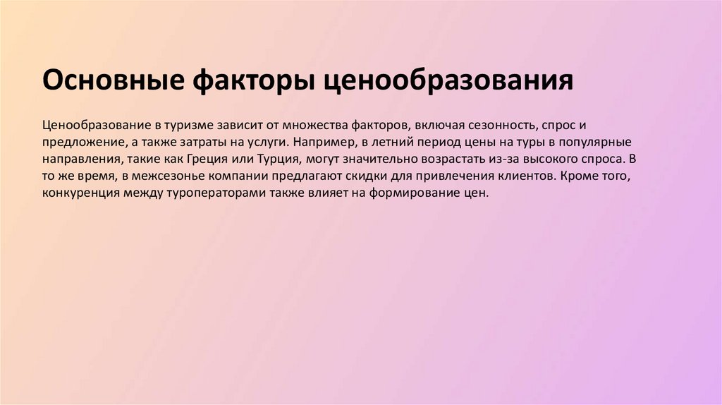 Основные факторы ценообразованияЦенообразование в туризме зависит от множества факторов, включая сезонность, спрос и