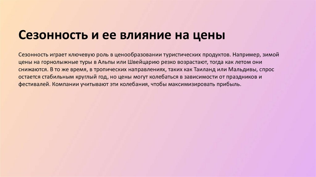 Сезонность и ее влияние на ценыСезонность играет ключевую роль в ценообразовании туристических продуктов. Например, зимой