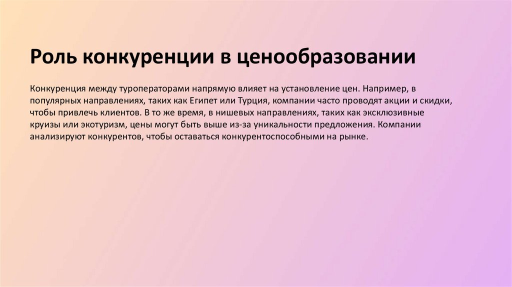 Роль конкуренции в ценообразованииКонкуренция между туроператорами напрямую влияет на установление цен. Например, в