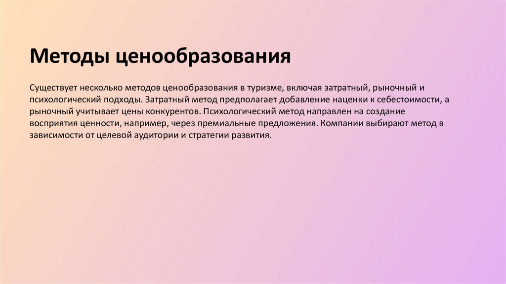 Методы ценообразованияСуществует несколько методов ценообразования в туризме, включая затратный, рыночный и