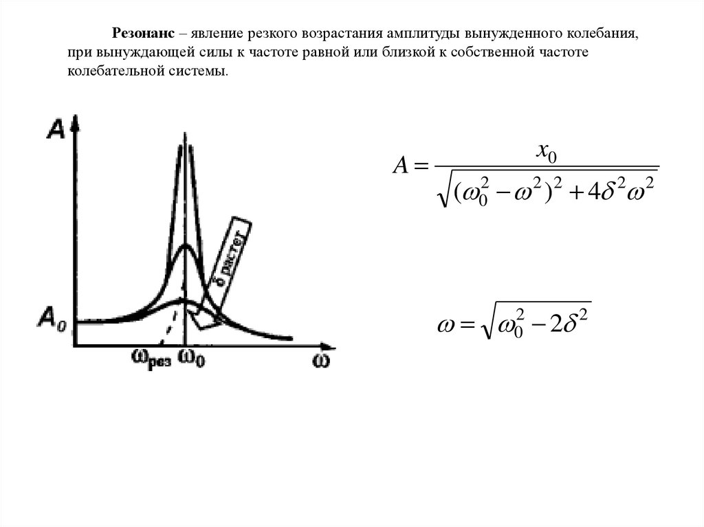 Резонанс – явление резкого возрастания амплитуды вынужденного колебания,при вынуждающей силы к частоте равной или близкой к собственной частоте