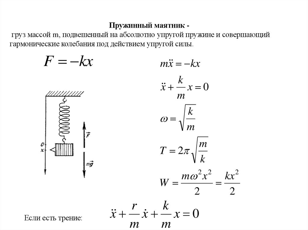 Пружинный маятник груз массой m, подвешенный на абсолютно упругой пружине и совершающийгармонические колебания под действием упругой силы.