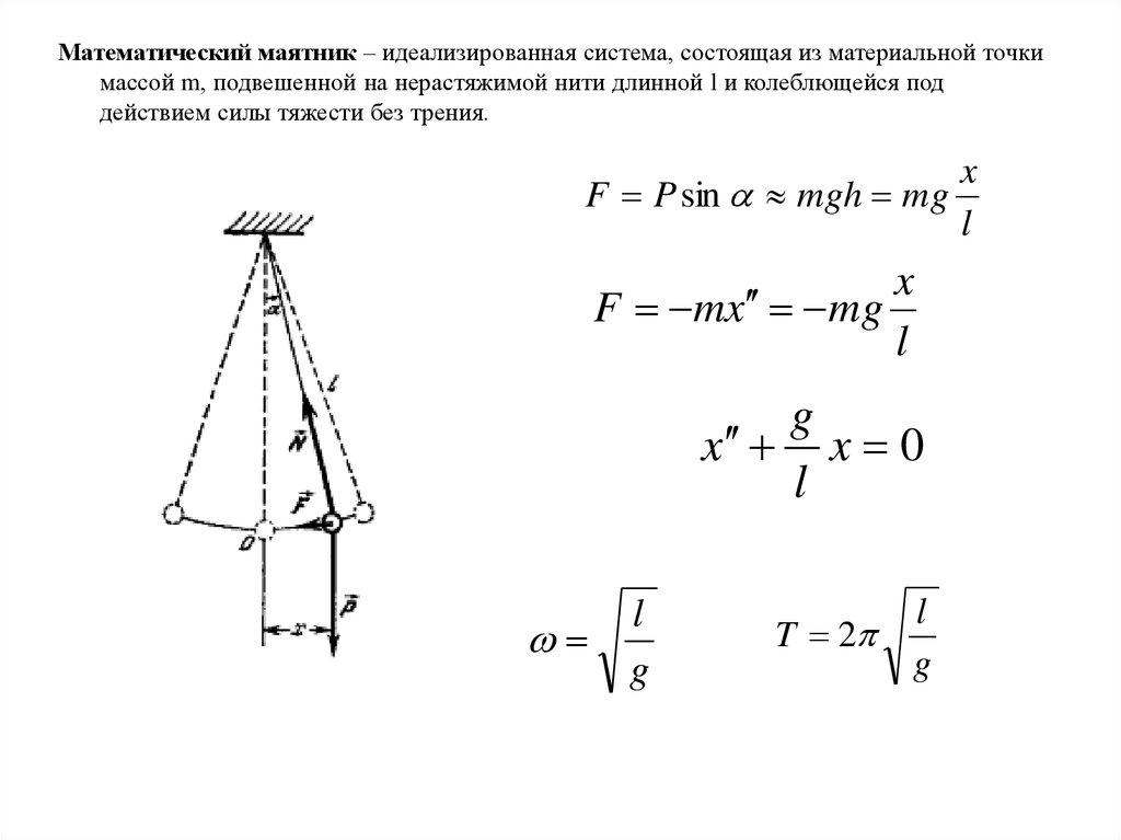 Математический маятник – идеализированная система, состоящая из материальной точкимассой m, подвешенной на нерастяжимой нити длинной l и колеблющейся под