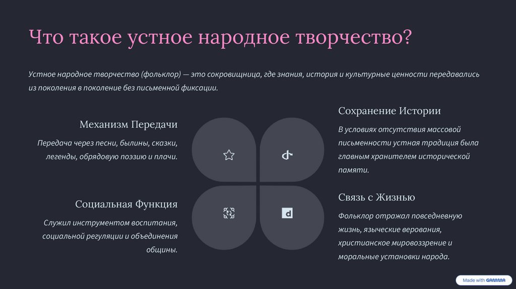 Что такое устное народное творчество?Устное народное творчество (фольклор) — это сокровищница, где знания, история и культурные ценности передавались