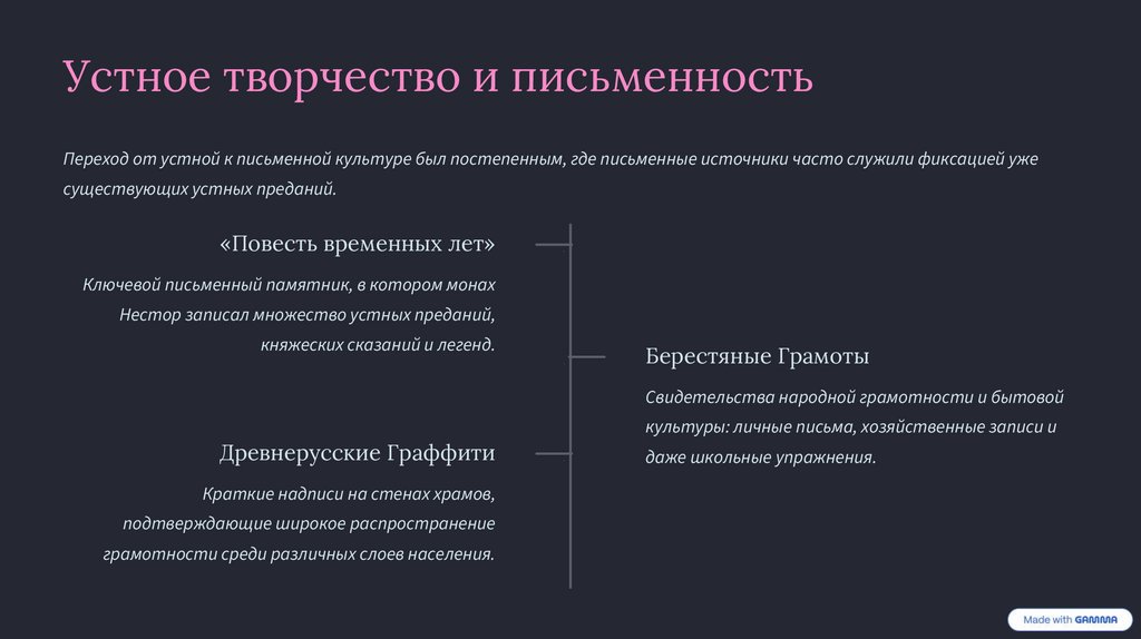 Устное творчество и письменностьПереход от устной к письменной культуре был постепенным, где письменные источники часто служили фиксацией уже