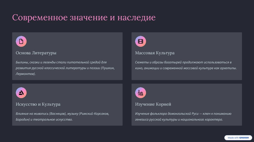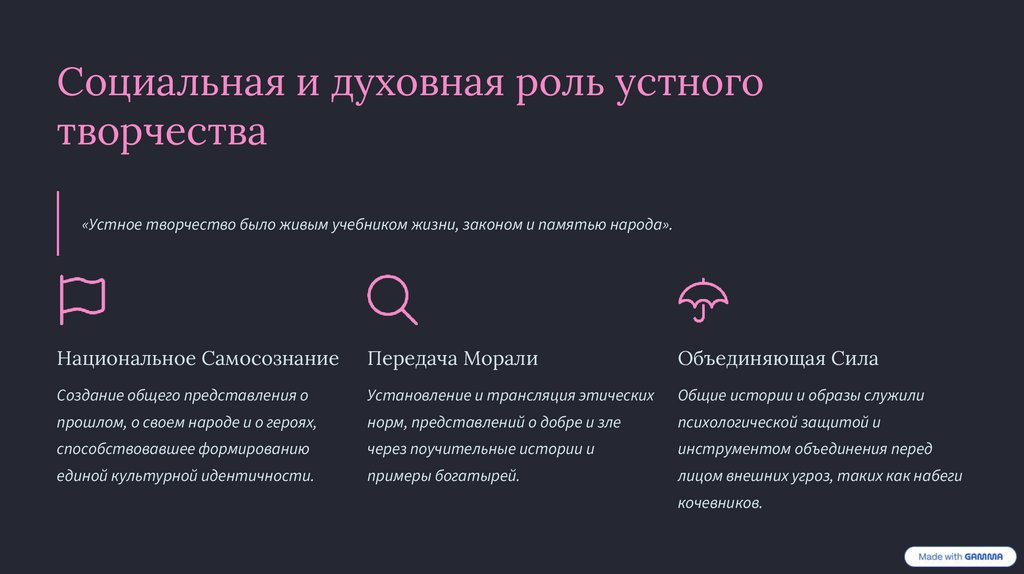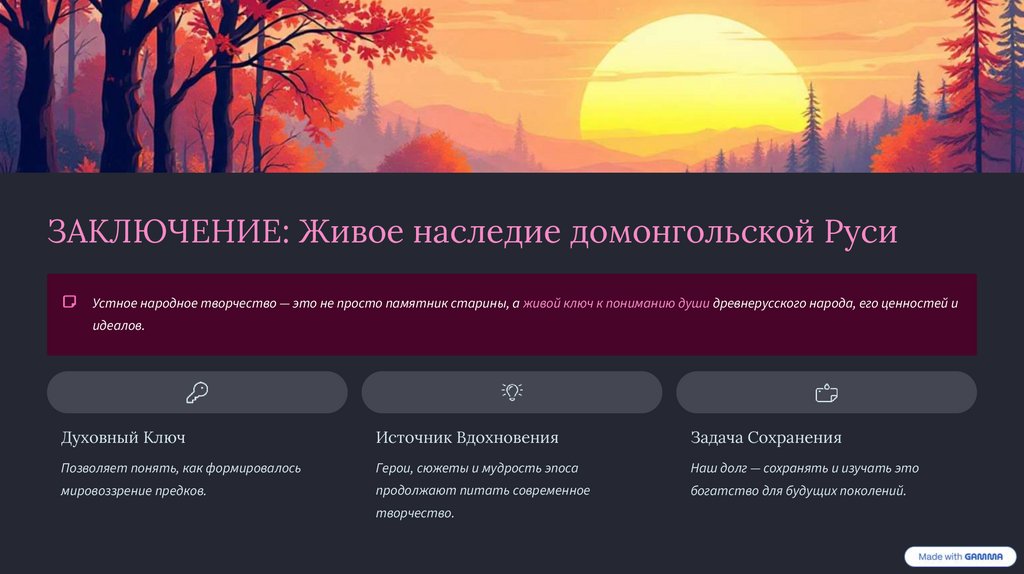 ЗАКЛЮЧЕНИЕ: Живое наследие домонгольской РусиУстное народное творчество — это не просто памятник старины, а живой ключ к пониманию души древнерусского народа, его ценностей и