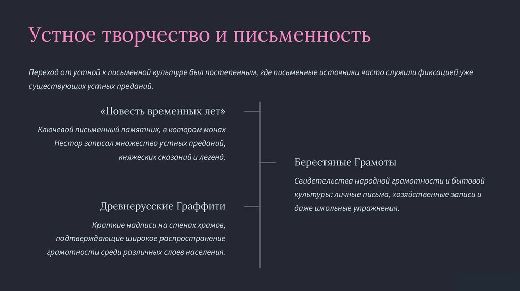 Переход от устной к письменной культуре был постепенным, где письменные источники часто служили фиксацией уже