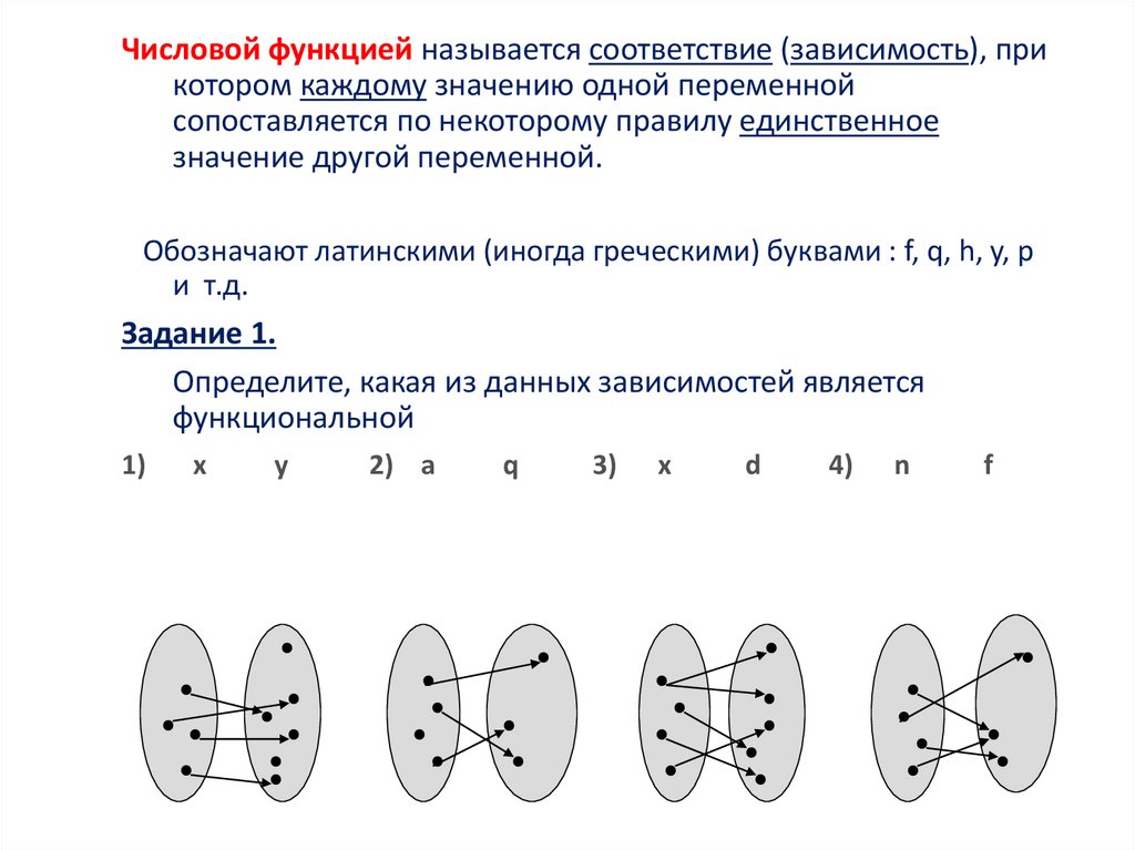 Числовой функцией называется соответствие (зависимость), прикотором каждому значению одной переменной