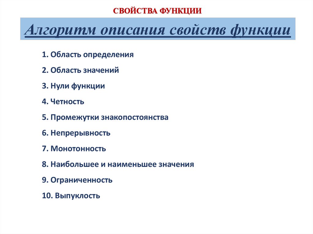 СВОЙСТВА ФУНКЦИИАлгоритм описания свойств функции