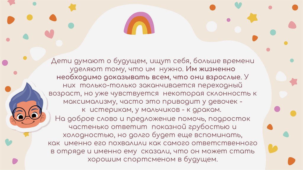 Дети думают о будущем, ищут себя, больше времениуделяют тому, что им нужно. Им жизненно