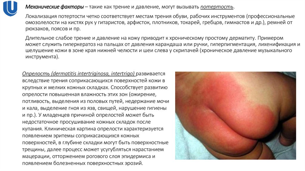 Механические факторы – такие как трение и давление, могут вызывать потертость.Локализация потертости четко соответствует местам трения обуви, рабочих инструментов (профессиональные