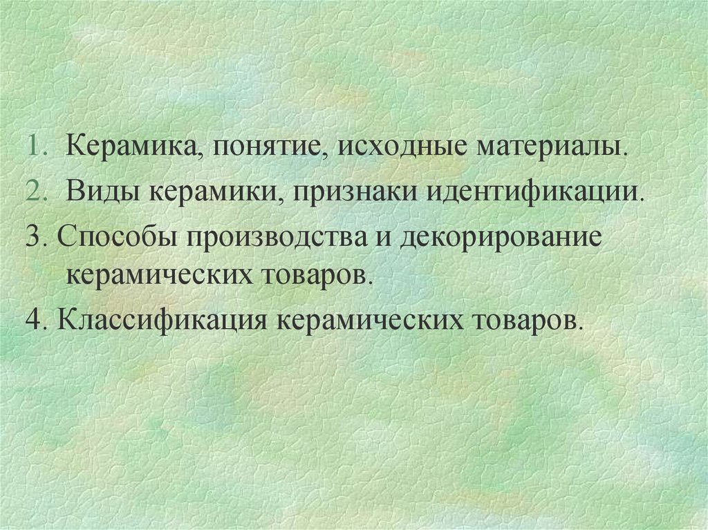 1. Керамика, понятие, исходные материалы.2. Виды керамики, признаки идентификации.