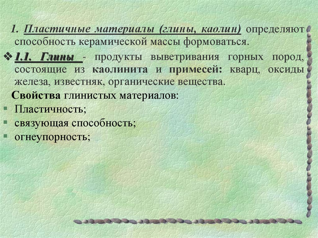 1. Пластичные материалы:- глины,