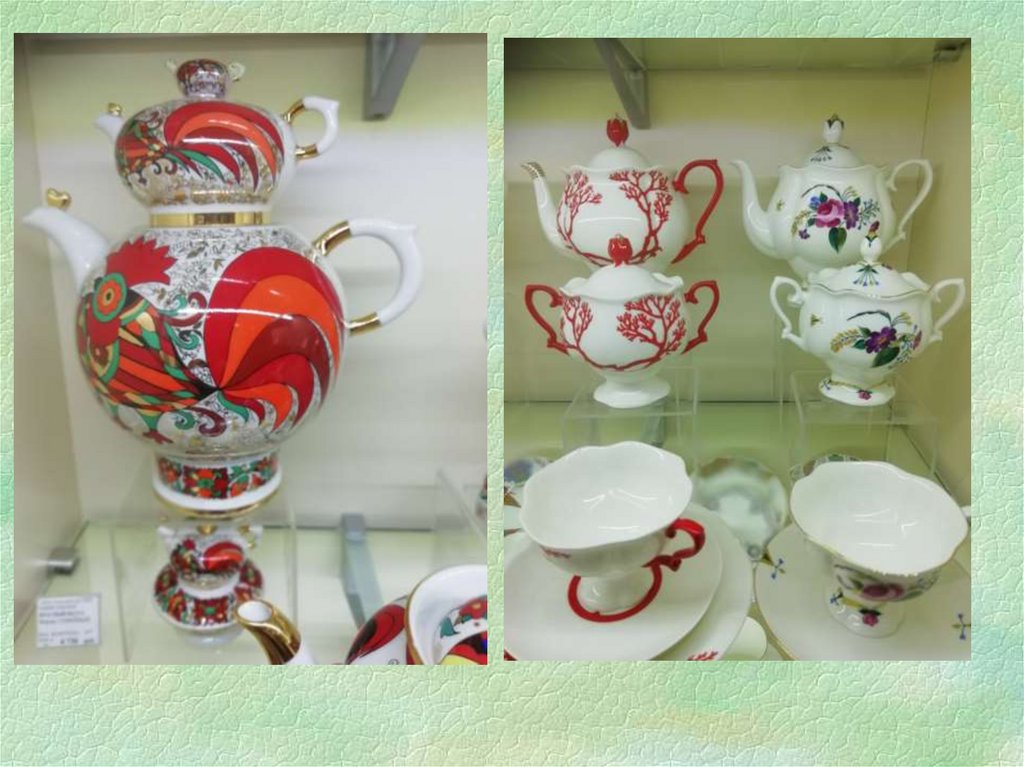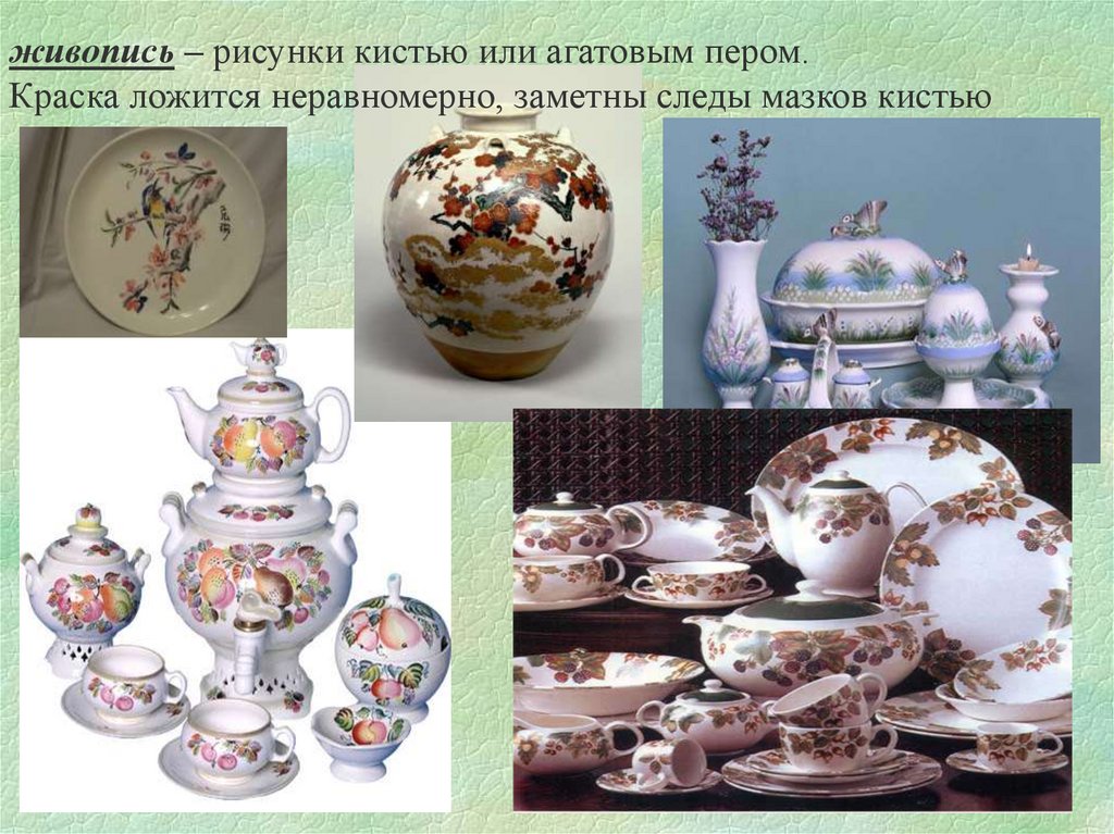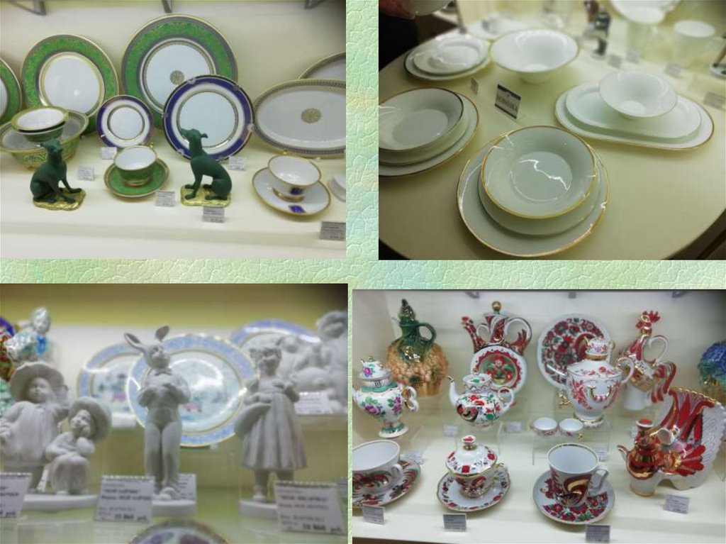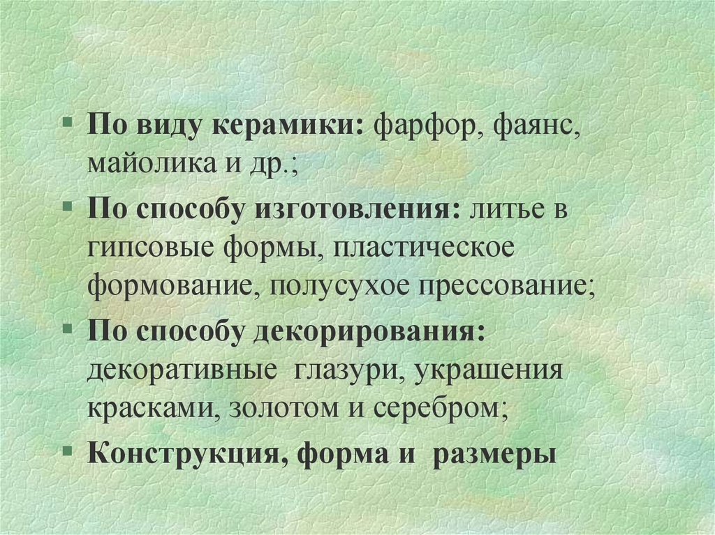 По виду керамики: фарфор, фаянс,майолика и др.;