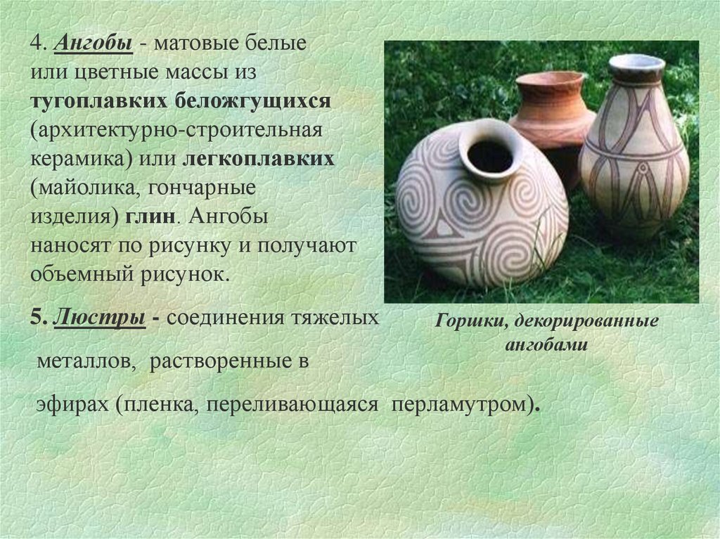 4. Ангобы - матовые белыеили цветные массы из