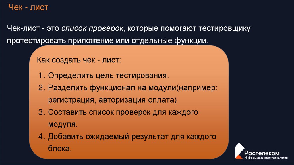 Чек - листЧек-лист - это список проверок, которые помогают тестировщику