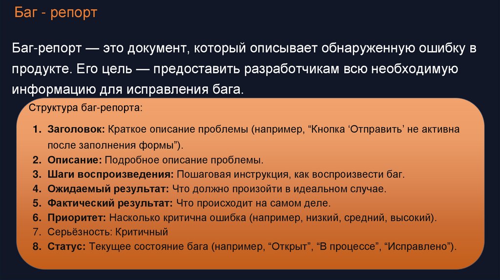 Баг - репортБаг-репорт — это документ, который описывает обнаруженную ошибку в