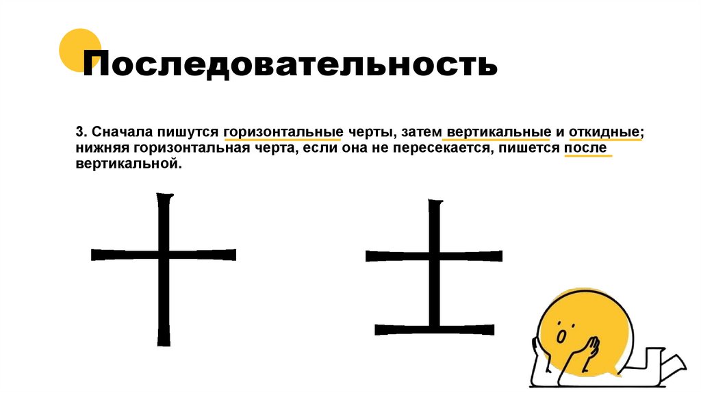 Последовательность3. Сначала пишутся горизонтальные черты, затем вертикальные и откидные;