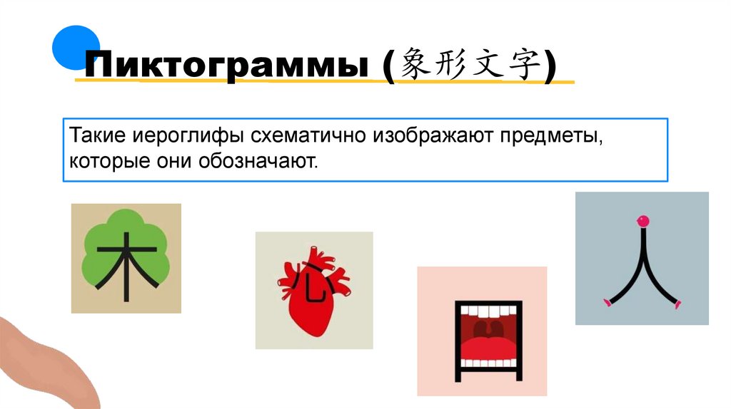 Пиктограммы (象形文字)Такие иероглифы схематично изображают предметы,