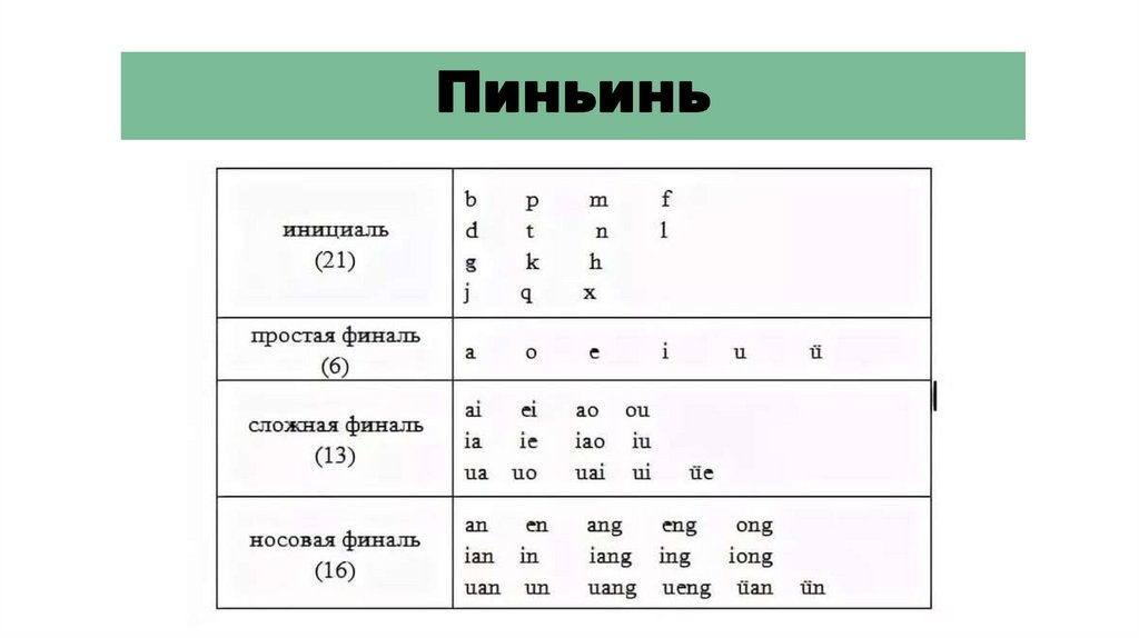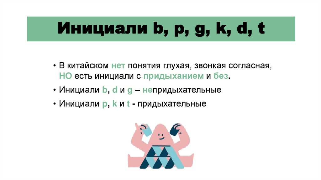 Инициали b, p, g, k, d, t• В китайском нет понятия глухая, звонкая согласная,