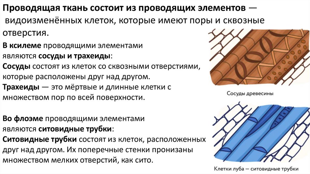 Проводящая ткань состоит из проводящих элементов —видоизменённых клеток, которые имеют поры и сквозные