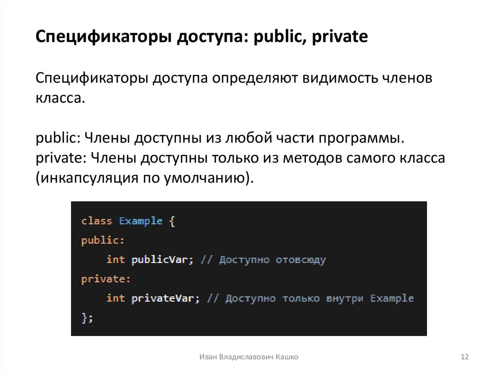 Спецификаторы доступа: public, privateСпецификаторы доступа определяют видимость членов