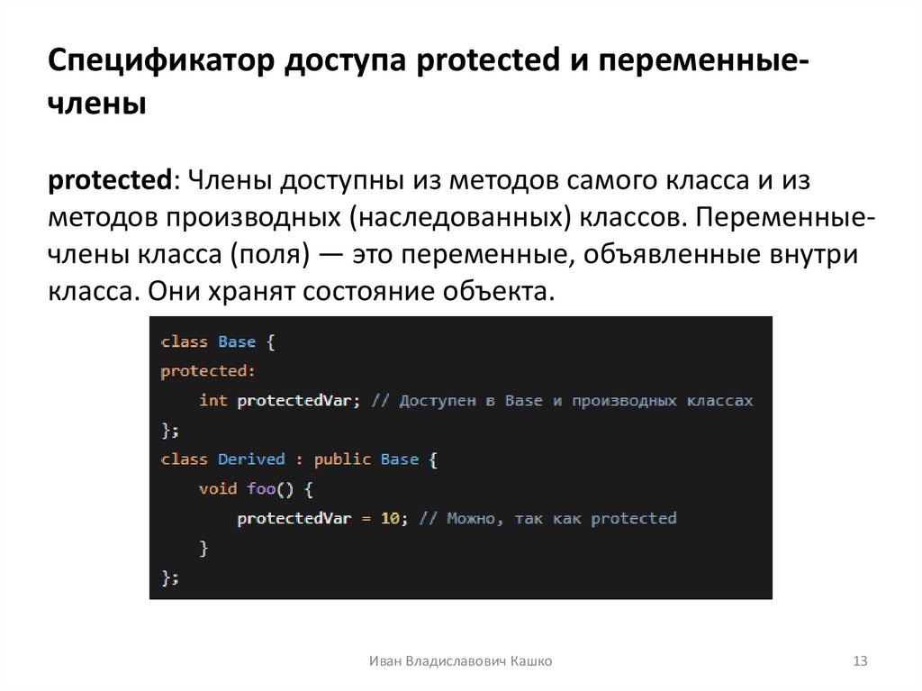 Спецификатор доступа protected и переменныечленыprotected: Члены доступны из методов самого класса и из