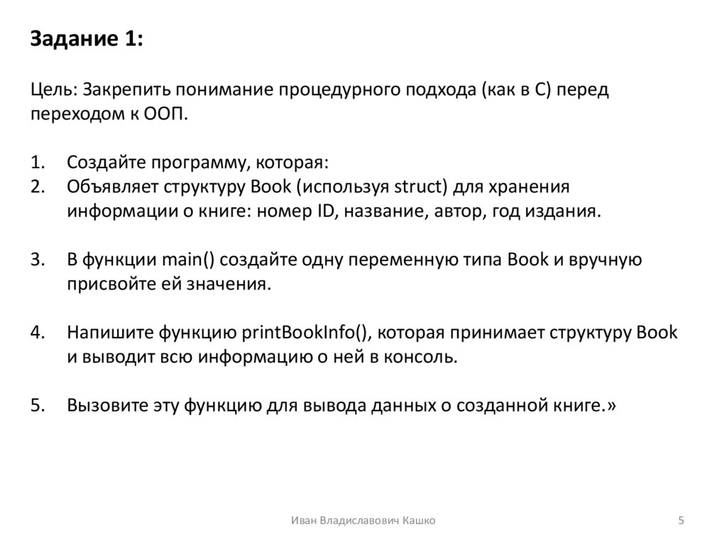 Задание 1:Цель: Закрепить понимание процедурного подхода (как в C) перед