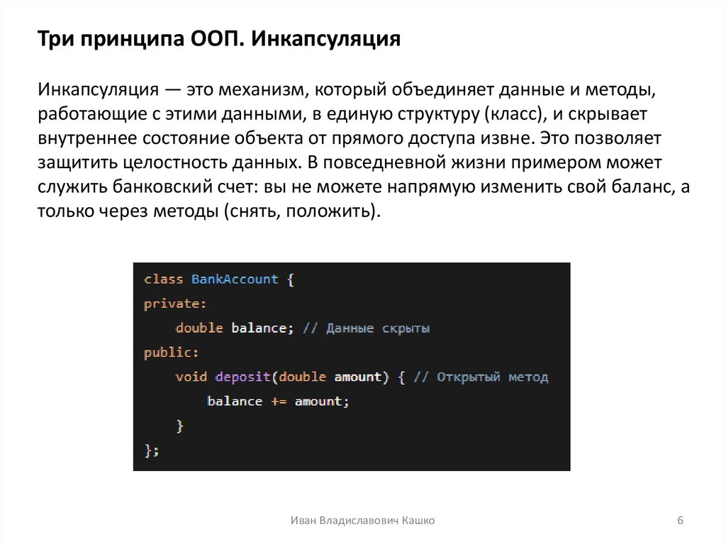 Три принципа ООП. ИнкапсуляцияИнкапсуляция — это механизм, который объединяет данные и методы,